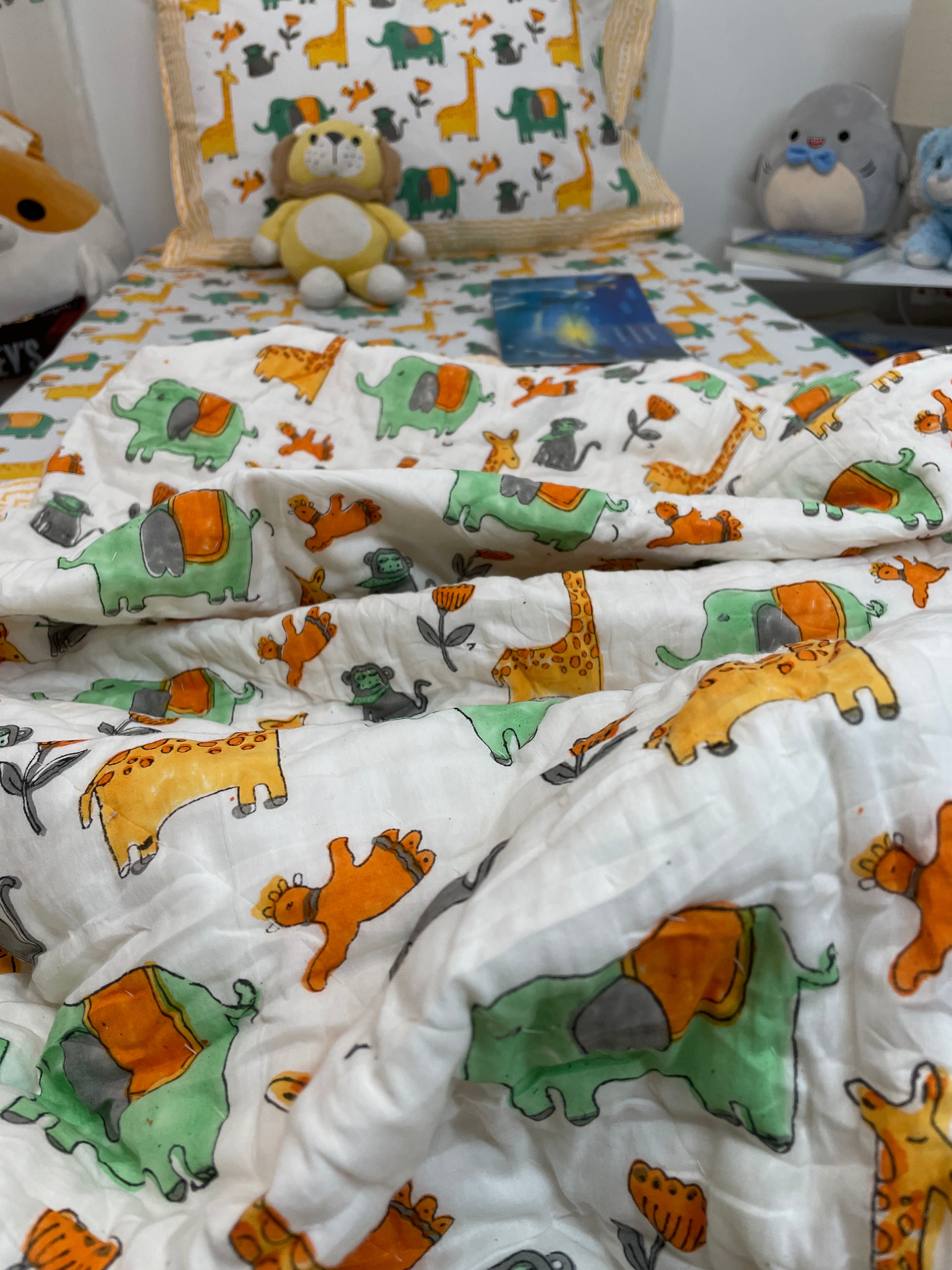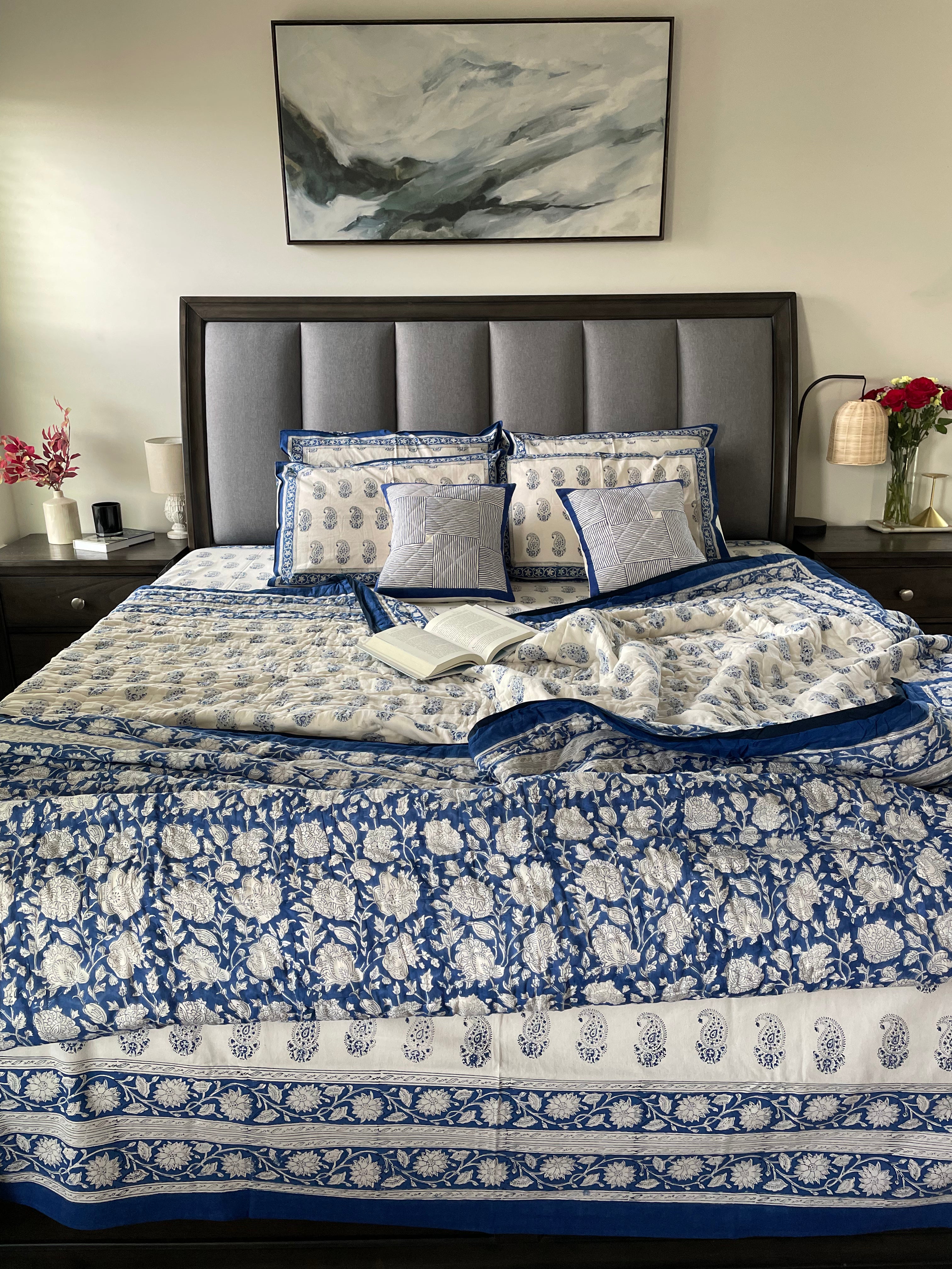 Starting with the hand-carved wooden blocks dipped in vibrant dyes, which are intricately pressed onto the fabric. After careful printing, the sheets undergo a meticulous drying process, ensuring the colors set beautifully, resulting in unique and artfully crafted bedding.