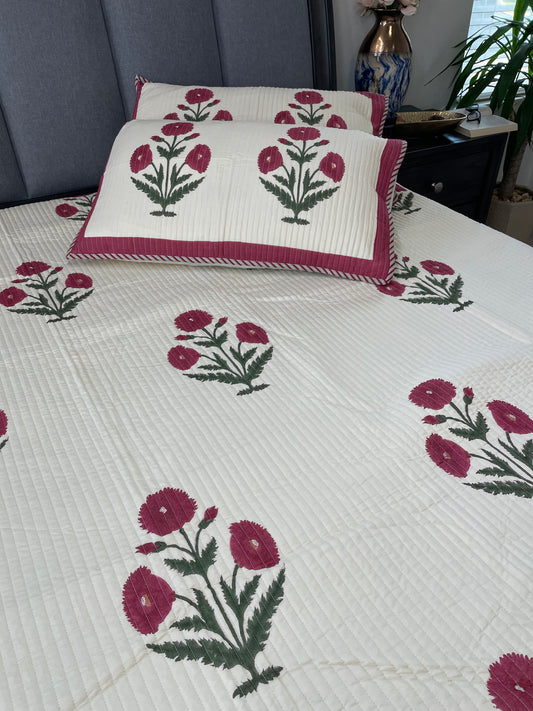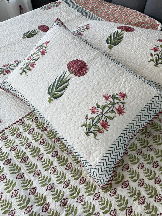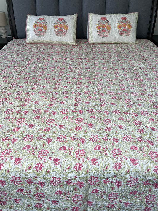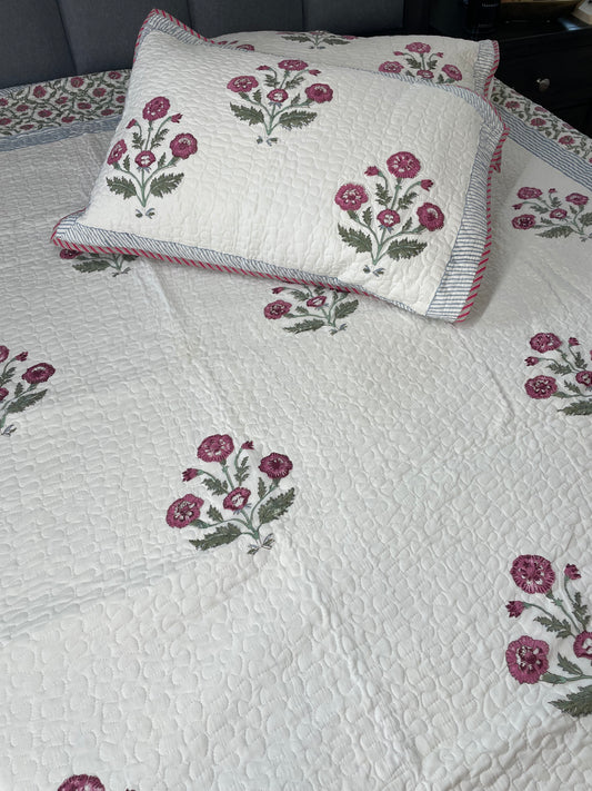 Vintage Bloom Handblock printed Reversible Mulmul quilted Bedcover - Quilted Pillow cover Included