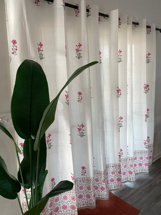 Pink Petal Paradise Hand Block Printed Cotton Curtain (2 Panels)