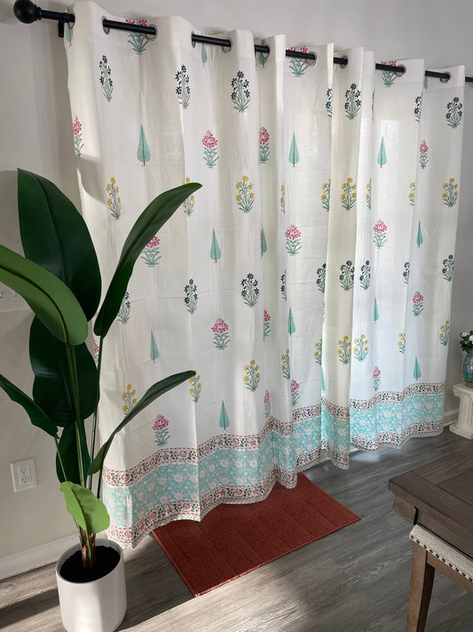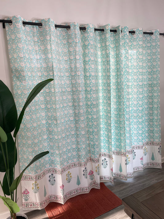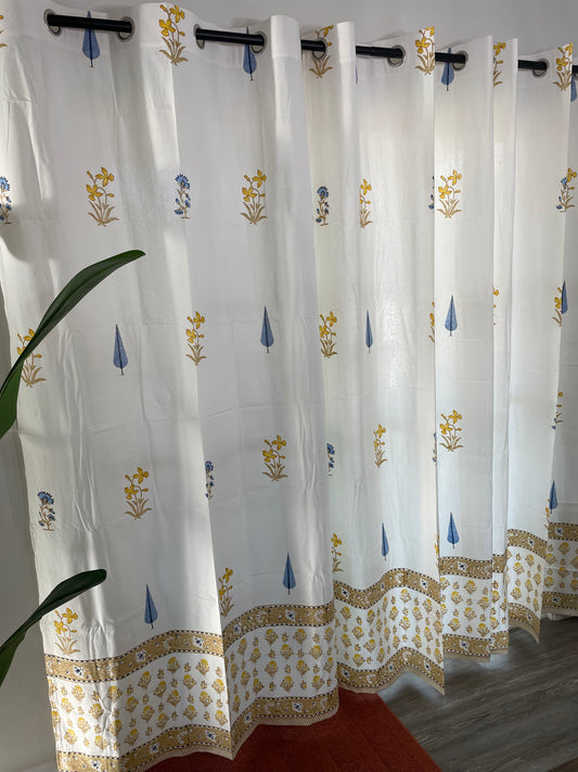 Sunlit Sky Floral Hand Block Printed Cotton Curtain (2 Panels)