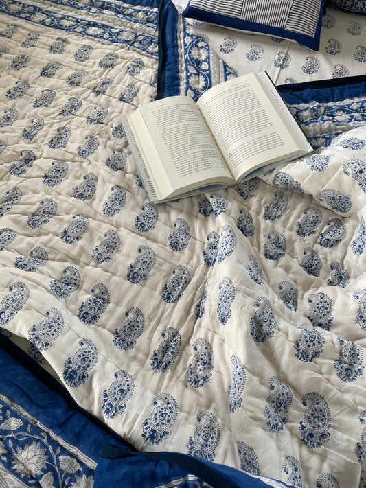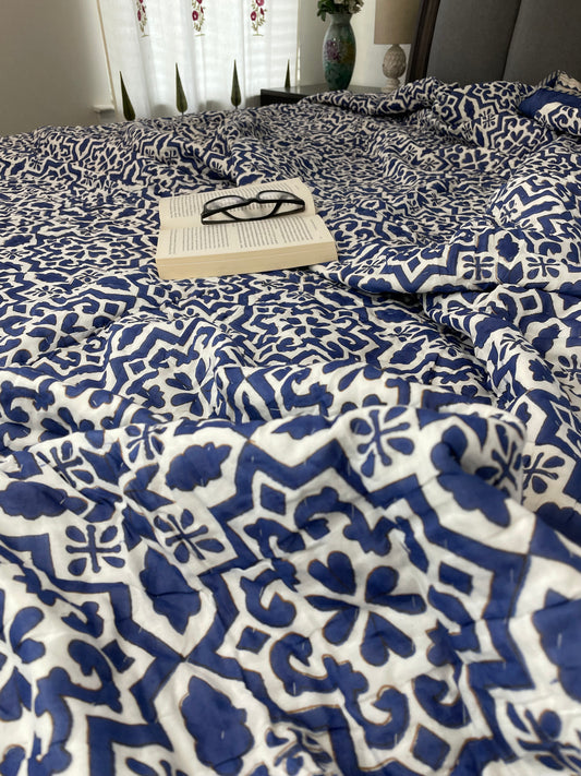 Indigo Dreams Handblocked and Hand Stitched Reversible Mulmul Cotton Quilt