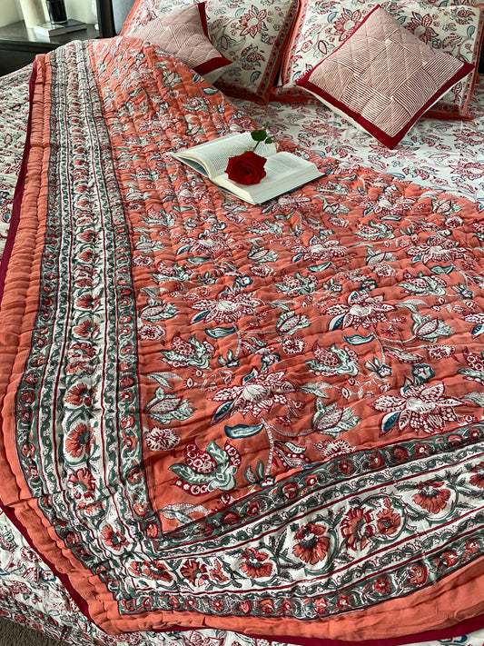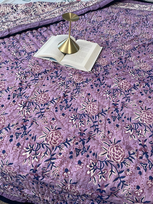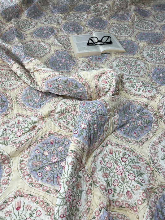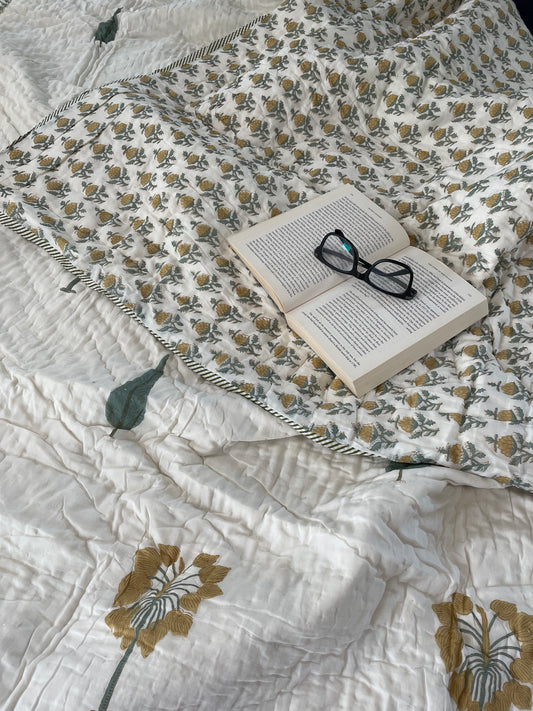 Wildflower Whispers Handblocked and Hand Stitched Reversible Mulmul Cotton Quilt