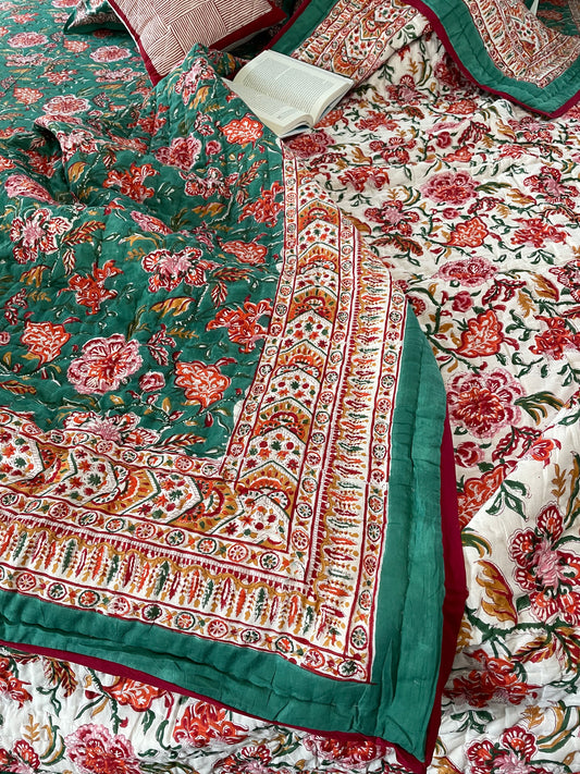 Enchanting Meadows Handblocked and Hand Stitched Reversible Mulmul Cotton Quilt