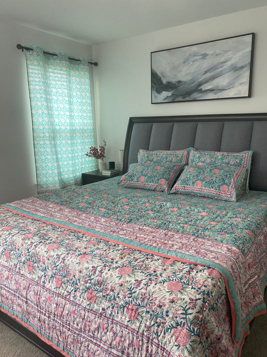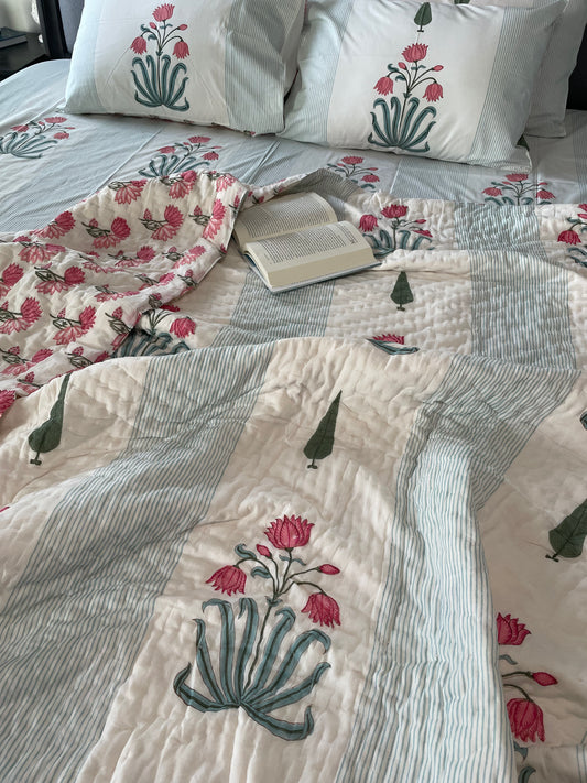 Serenity Gardens Handblocked and Hand Stitched Reversible Mulmul Cotton Quilt