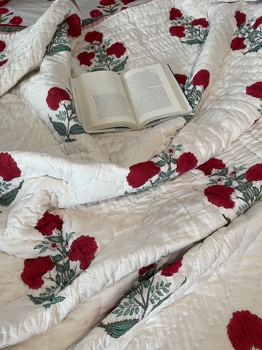 Red Poppy Blossom Handblocked and Hand Stitched Reversible Mulmul Cotton Quilt
