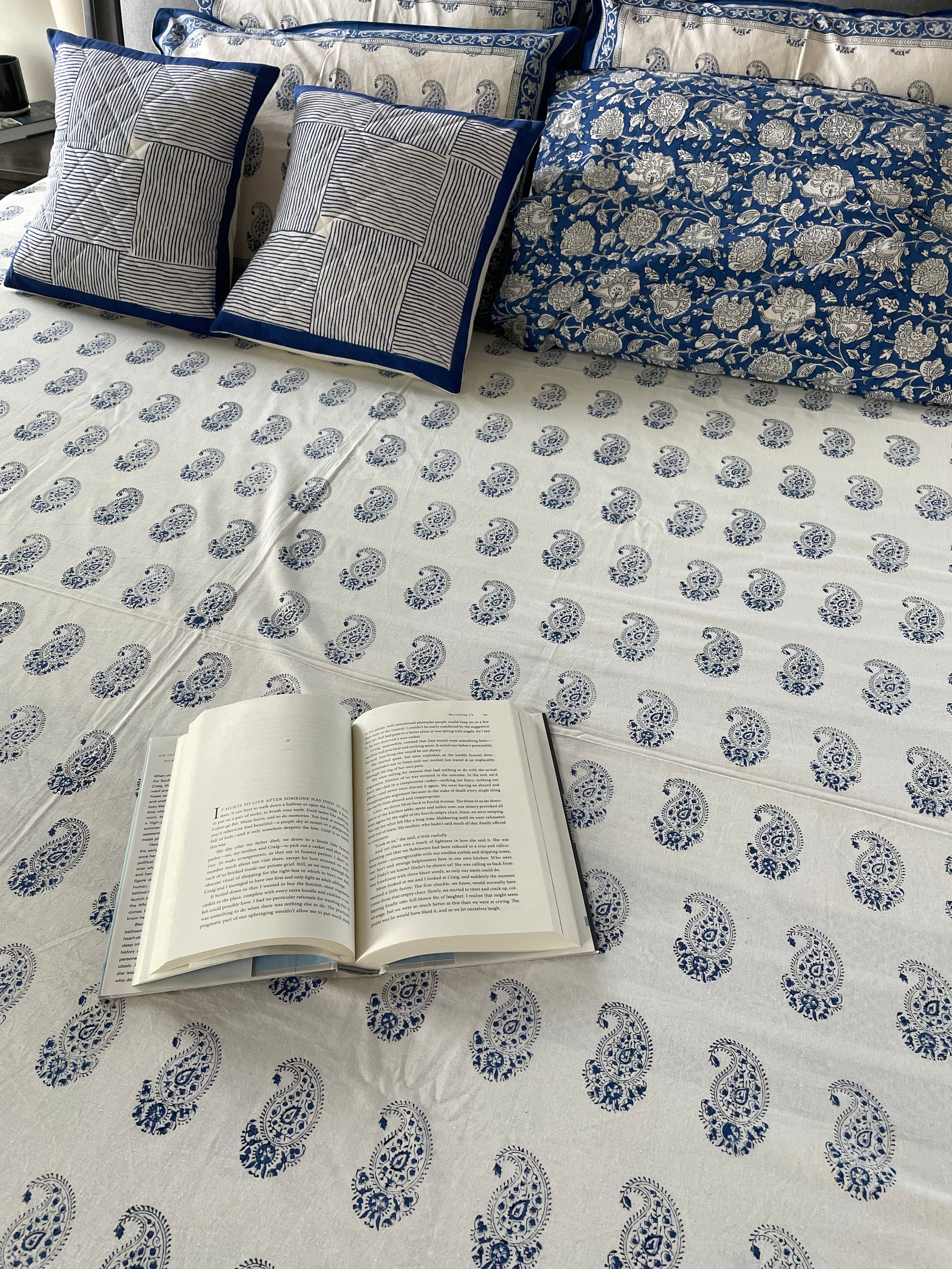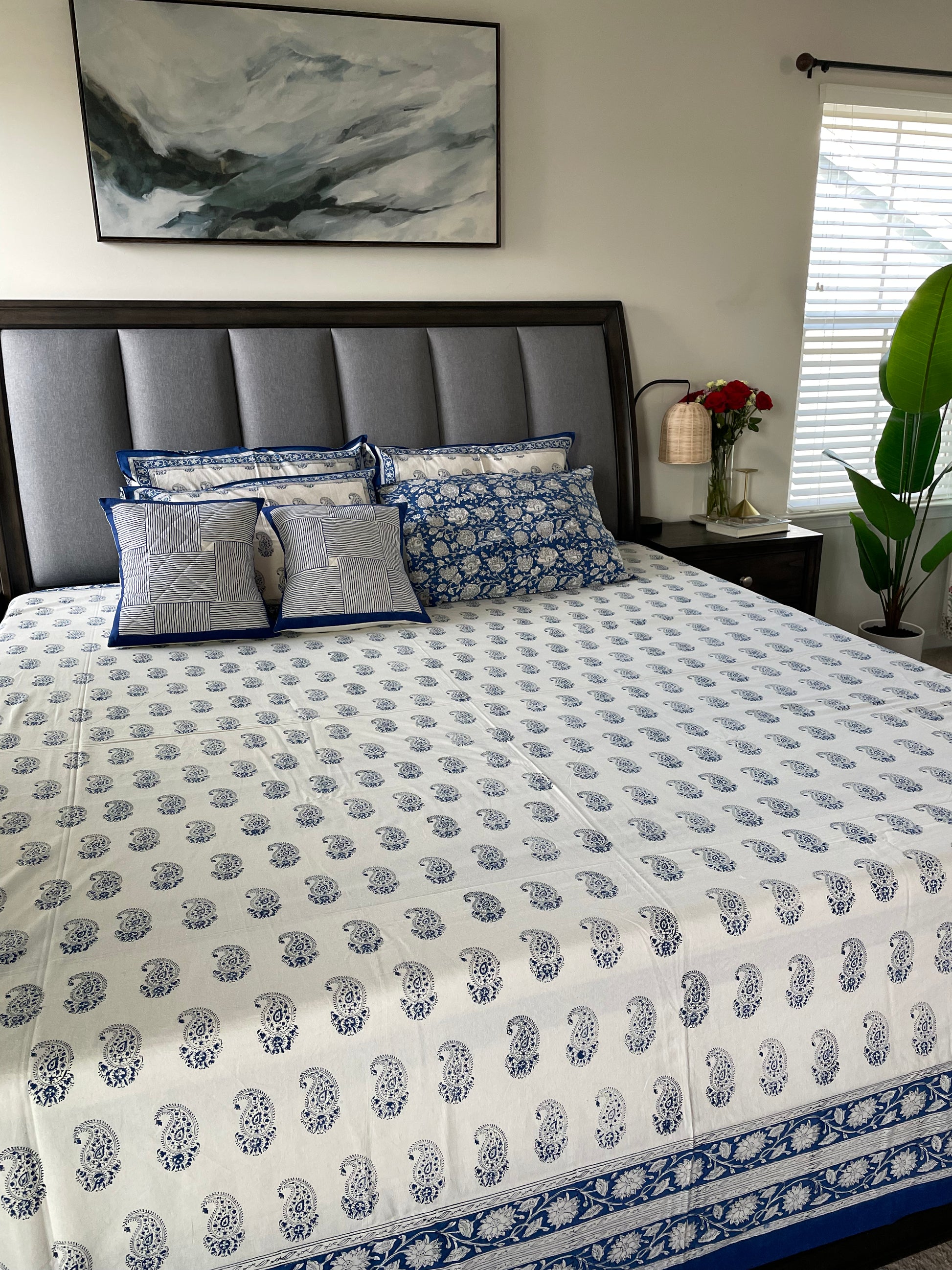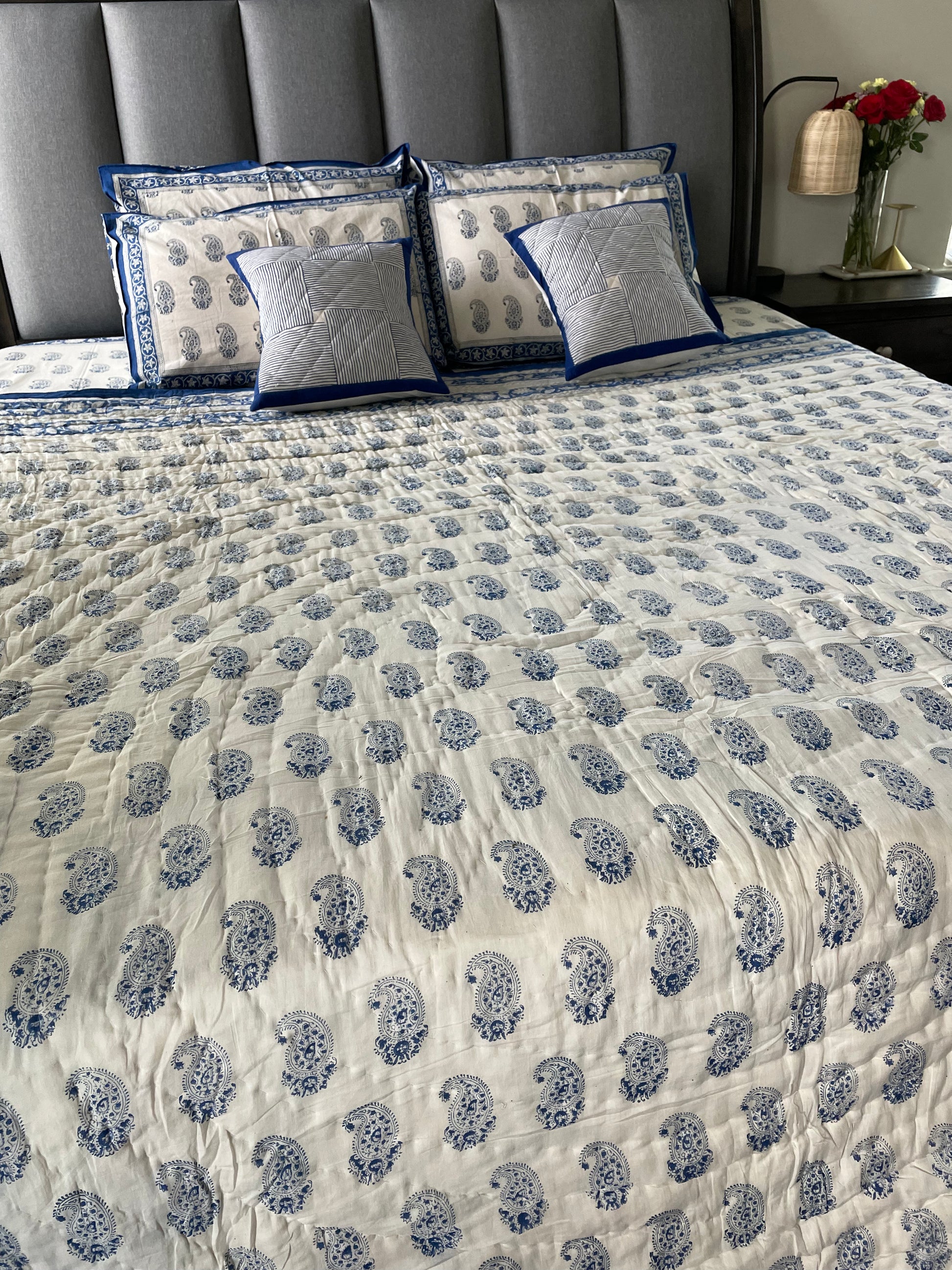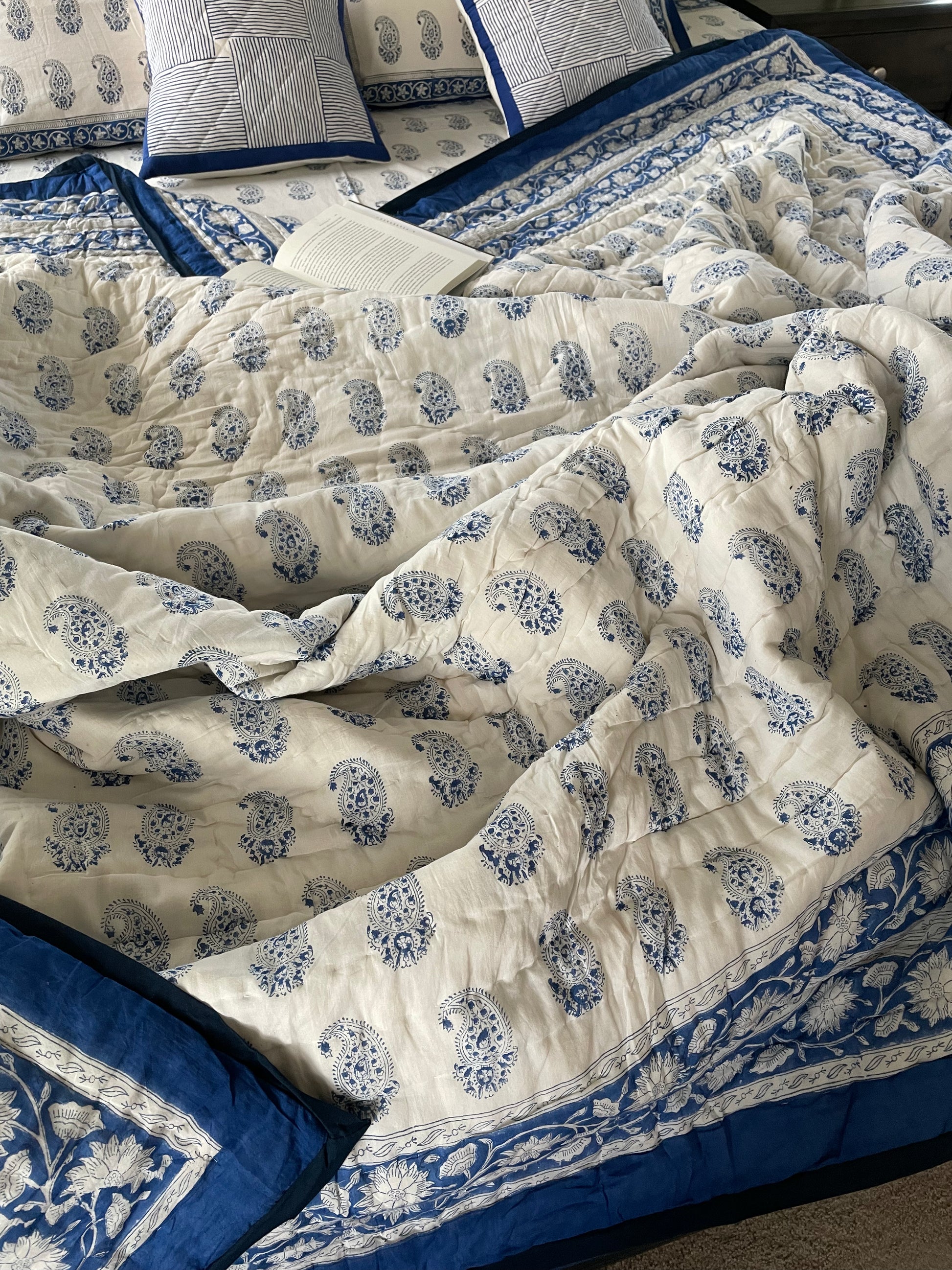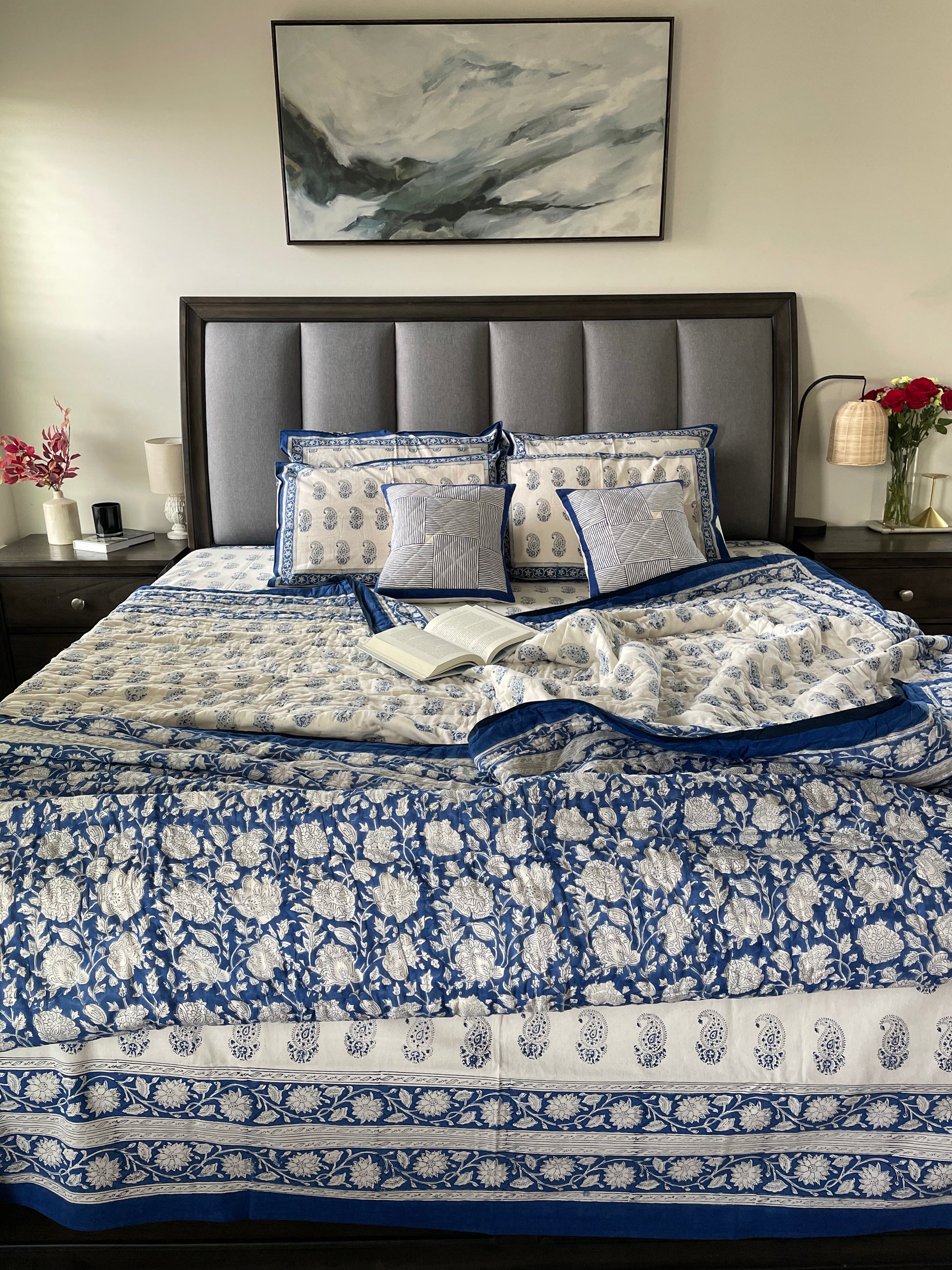 Indulge in the artistry of handblock printing with our exquisite bedding set, featuring a luxurious quilt and coordinating bedsheet. Elevate your sleep sanctuary with timeless elegance and artisanal craftsmanship